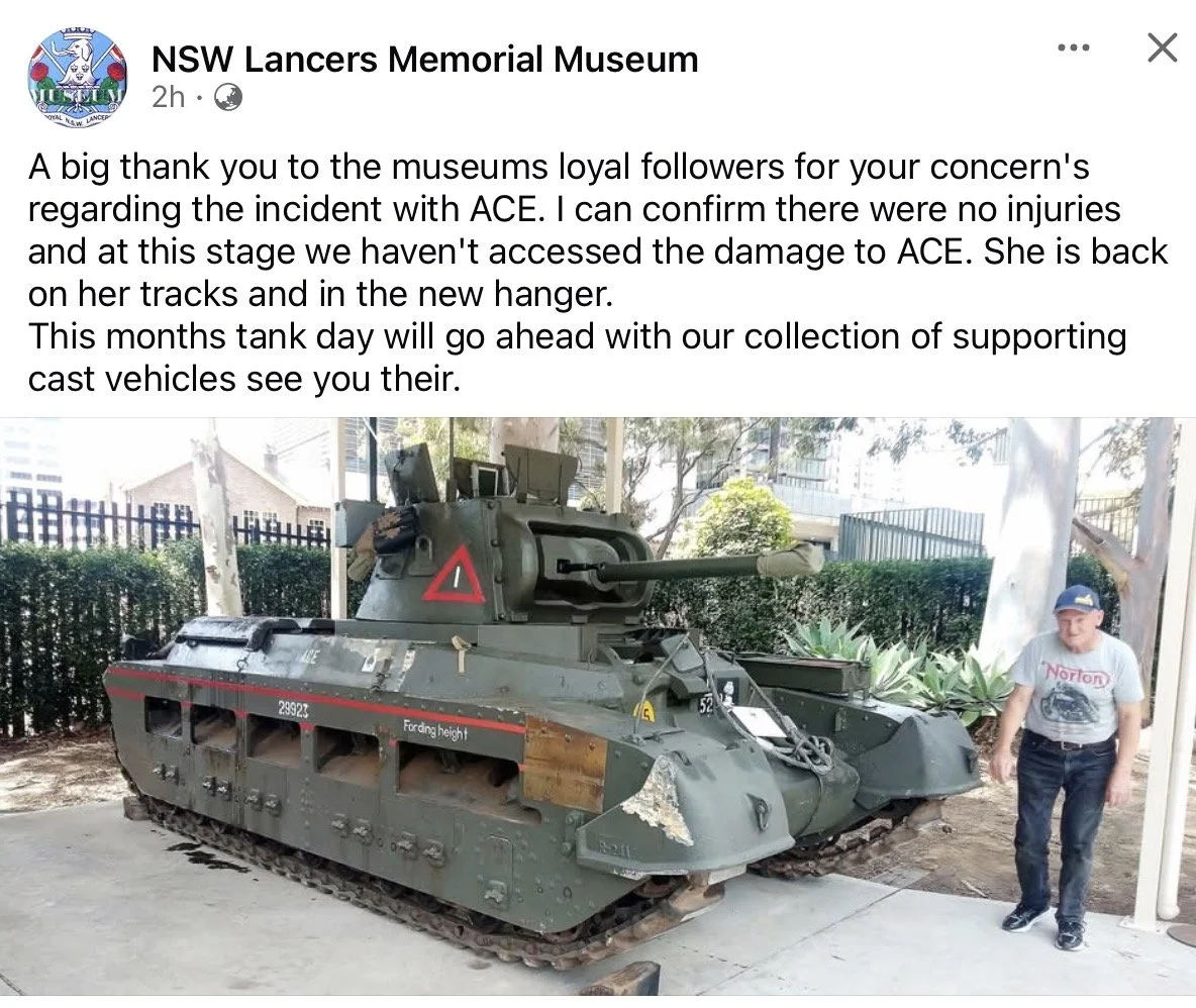 Ace, the Lancer Barracks Museum Matilda II in Sydney’s Parramatta district appear to have come a cropper and we don’t believe it’s how maintenance is recommended.